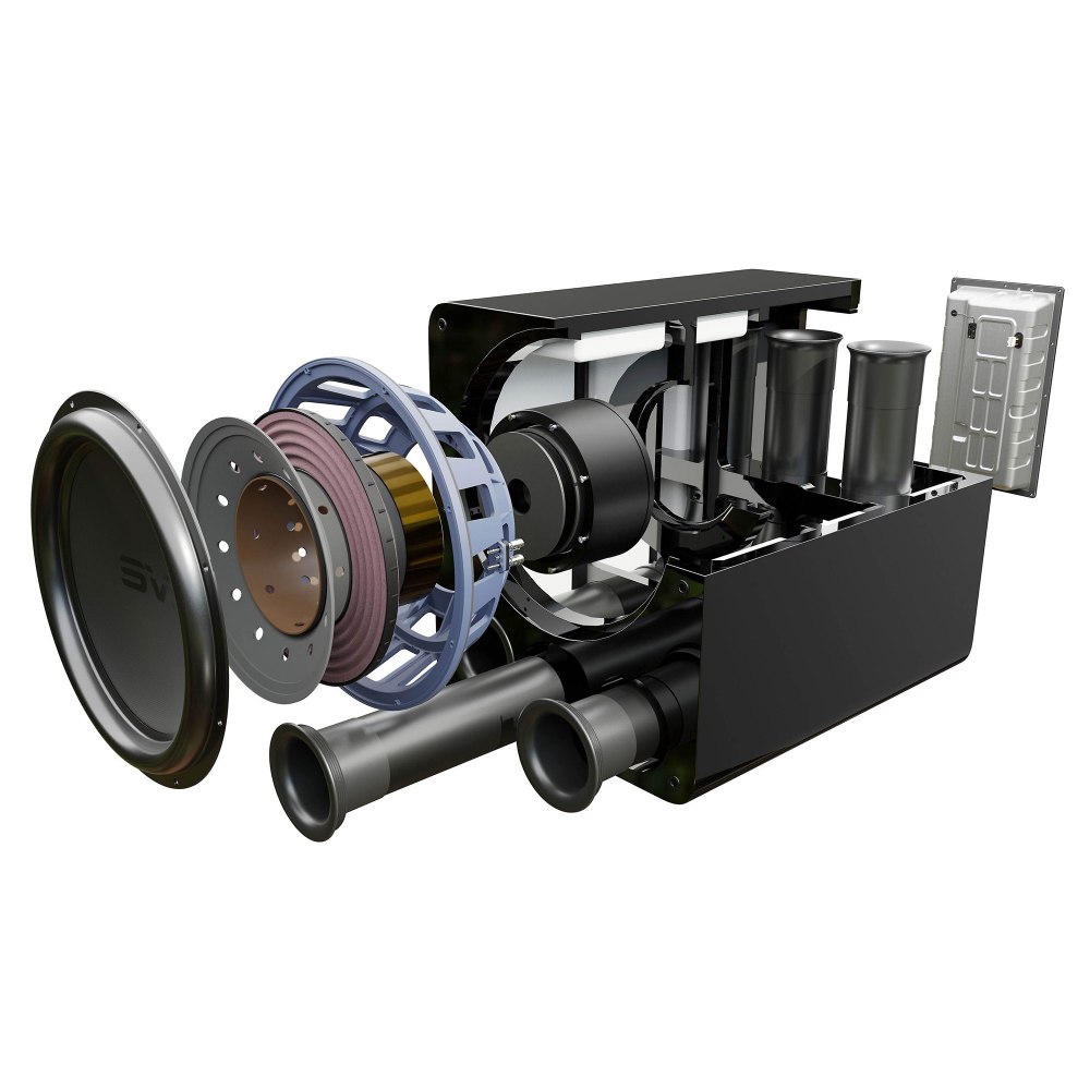 В конструкции используется фронтально излучающий 17-дюймовый длинноходный динамик с массивной магнитной системой и конфигурацией overhung. Такое техническое исполнение обеспечивает высокую линейность перемещения диффузора и стабильную работу при значительных нагрузках. Корпус фазоинверторного типа оснащен тремя портами и поддерживает стандартный, расширенный и герметичный режимы эксплуатации, что позволяет изменять характер низкочастотной отдачи в зависимости от акустических условий.